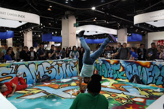 Next stop was up the stairs to Samsung and although I’ve never really liked their cameras I did really like all their displays- breakdancers, waterfalls and lego boats! We also stood in line for 45 minutes to get a photo on a vespa printed on a mug for free but the camera they were using was having problems connecting to wifi and the in camera editing looked very slow going anyway so we abandoned it.