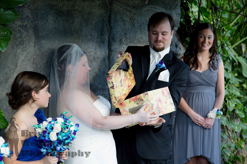 When I heard that Andrea and Evan were going to be getting married in a butterfly conservatory, I knew that I just had to be part of it! As a teenager I LOVED butterflys, maybe it was partially due to that Crazytown song, or something poetic about blossoming into an adult and the person you want to be, but either way I have 2 butterfly tattoos to remind me of it. The Cambridge Butterfly Conservatory was an amazing location and especially great for in the winter so that you can still have a summer feel to the photos!