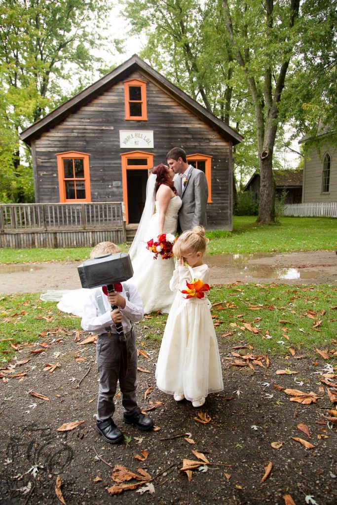 I had known Chantelle and Kyle for years, she was my go-to crochet outfit maker for a bunch of my newborn/ cake smash props. I photographed their family a bunch of times and was so happy when they asked me to photograph their big day. On a chilly fall day last year Clara and I captured them getting ready then their amazing first look at Fanshawe Pioneer Village. We had fun incorporating their love of superheros into their wedding party photos and their kids- the super adorable ring bearer and flower girl. The outdoor ceremony on the farm was beautiful and we were even able to get some awesome fog shots of the two newlyweds and then later in the night, dramatic rainy night photos. The reception was a lot of fun with many big moments captured and possibly the best last photo of the night ever (sorry Chantelle just had to share lol).