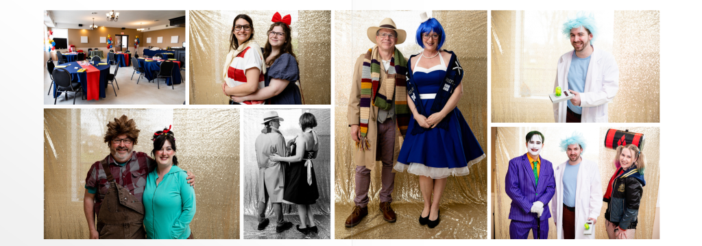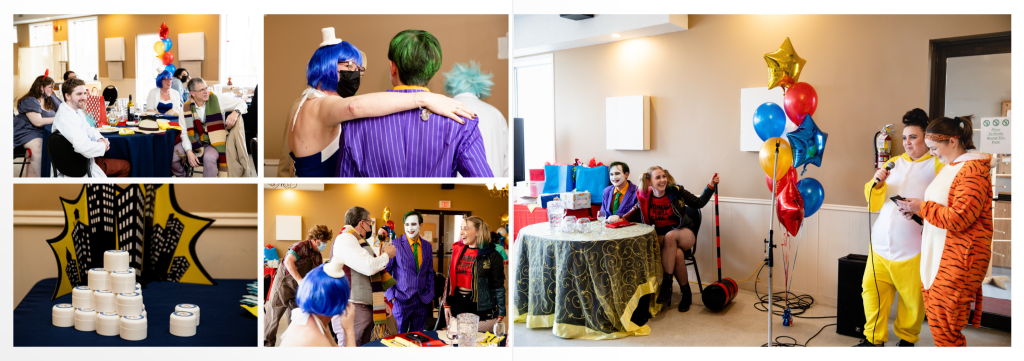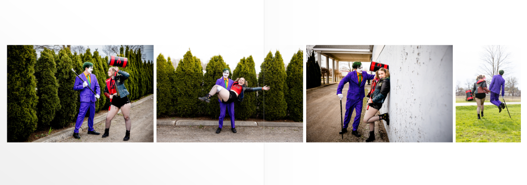 I wish every wedding was as personalized as Sara & Mike’s! Their Strathroy wedding photographer started at their home where they both got ready, they had a low key first look once she had her dress on when she came down the stairs. Their ceremony was held in a small chapel at the Portuguese Canadian club of Strathroy venue. The perfect modern ceremony was performed by Jodi from Something New. After a group photo of all of their guests and family photos, we captured some timeless and candid photos of their wedding party and the two of them with the soft April light on the grounds of the Portuguese club, not a particularly ‘ideal background’ but as you can see we created some magic with our compression lenses and shallow depth of field. It was then back to the couples house to change from their wedding outfits to cosplay! They were the Joker and Harley Quinn and even dyed their hair in between the ceremony and reception! Their reception was held in the upstairs area of the Portuguese club, an area with lots of natural light and I loved all of their comic book decor. After dinner and their first dance- Sweet but Psycho by Ava Max, they held a Magic the Gathering (aka “Magic”) tournament. Magic is a strategic card game, and it is a big part of their lives.