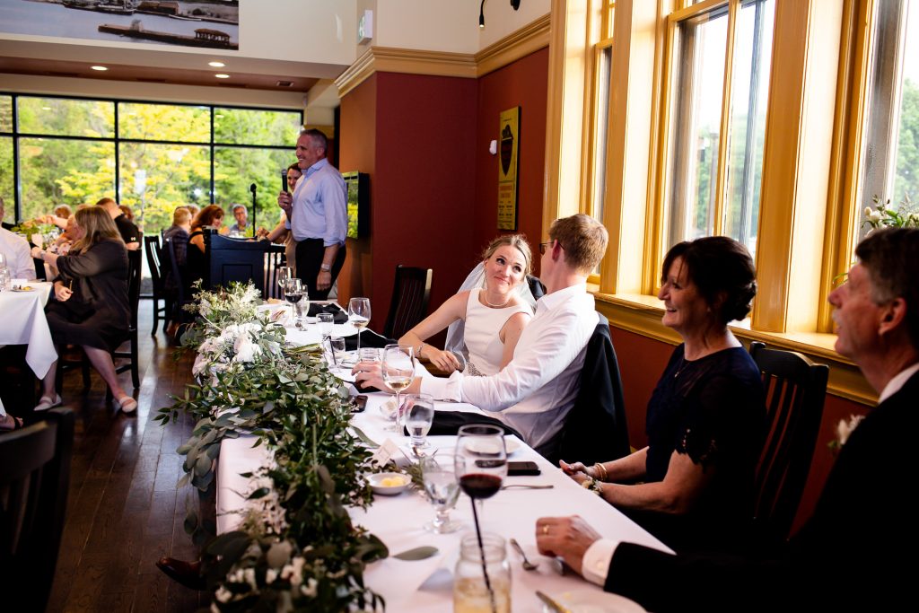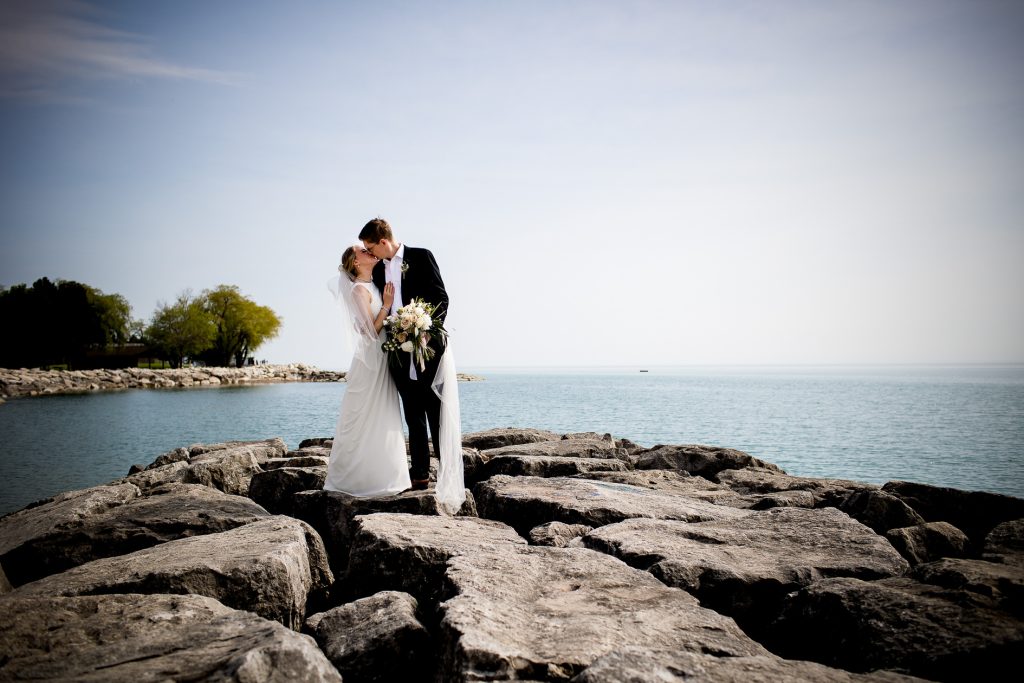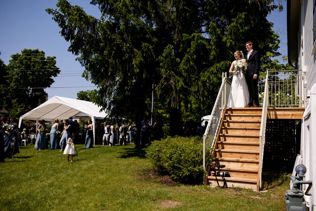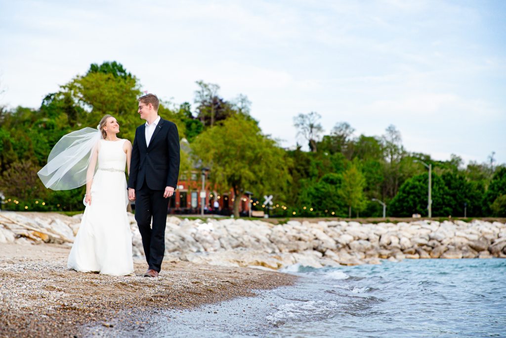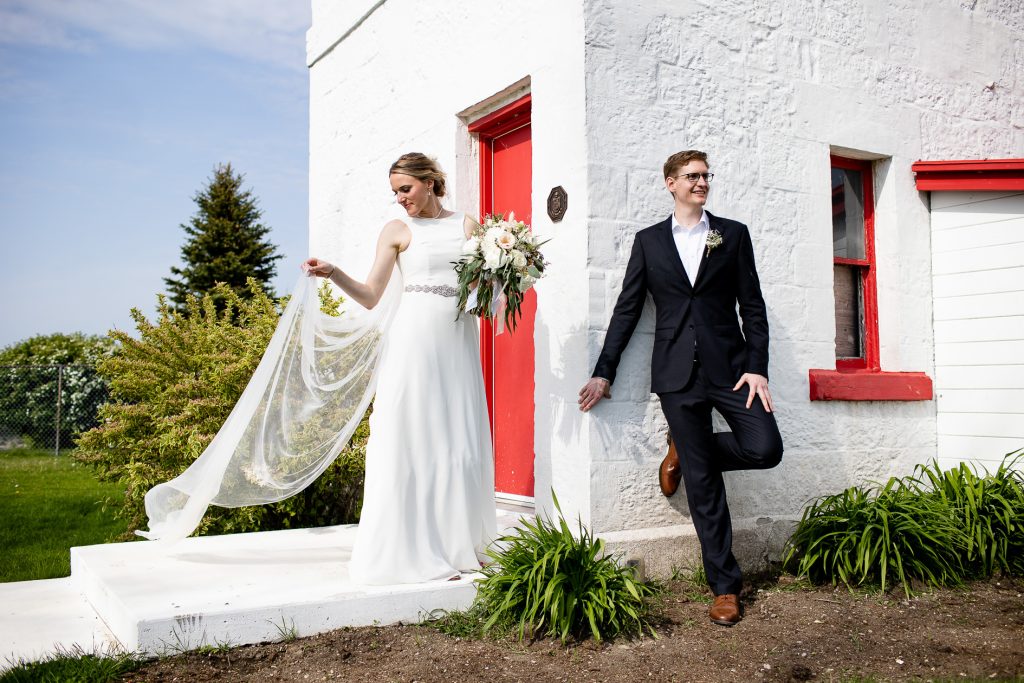 Clara and Lori photographed Nina and Adam’s Goderich Wedding Photography almost 1 year ago! Clara had got to know the couple at their Old Court House engagement session just days before their wedding- they live in the states. The days started off with each side of the wedding party getting ready in a couple of Airbnb’s in Bayfield. They then had their first look in the yard of one of their getting ready locations and afterwards headed to Bayfield Town Hall for their ceremony. After their formals of family, wedding party and couple photos at the beach in Goderich it was time for their reception at Beach Street Station on the beach in Goderich. They were super lucky with the weather to get such a gorgeous sunset and after dinner CLara and Lori captured a group photo outside the restaut