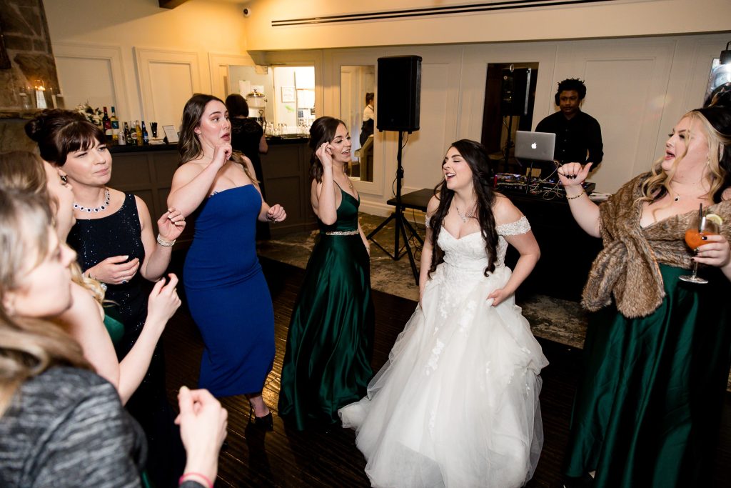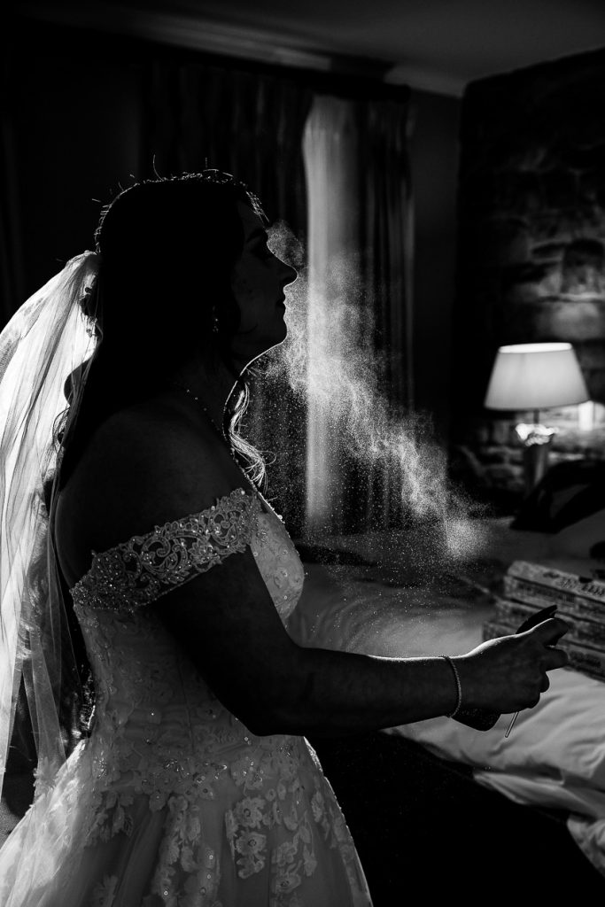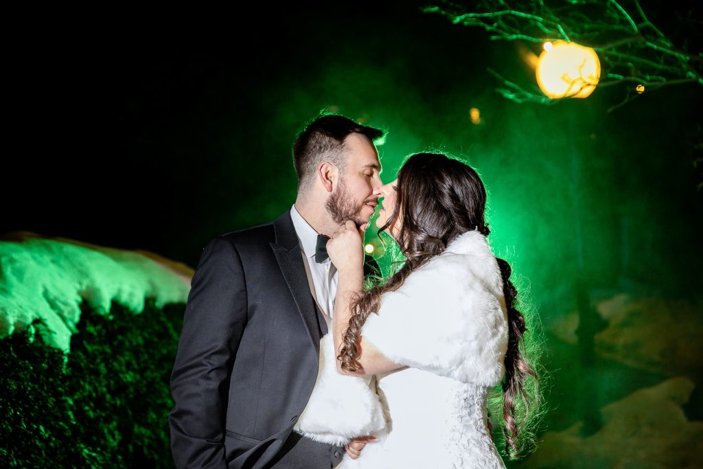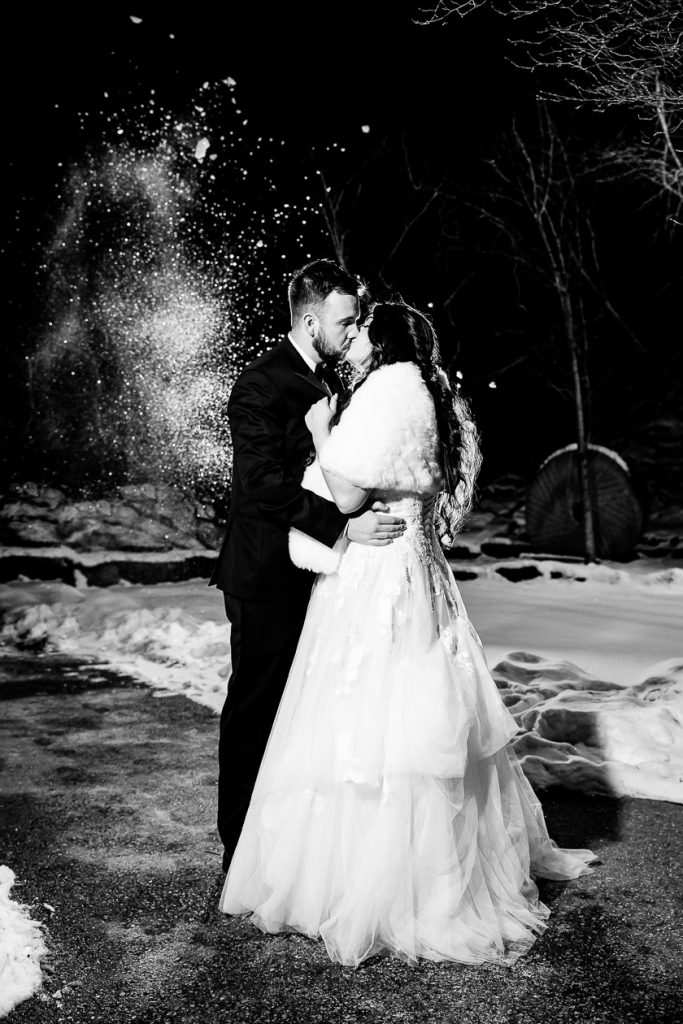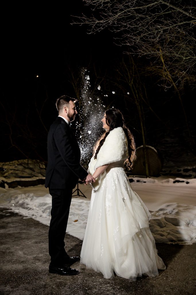 I started with photographing Emily and her side final moments of getting ready at the beautiful Barracks Inn, it was a gorgeous room for getting ready photos with plenty of natural light- although I think my favourite photo is with the backlight on the perfume. We then headed to Ancaster Mill where the staff were so helpful and welcoming. One of the coordinators even helped me with the fog and snow night photos! Their ceremony in The Miller’s Chapel was short but very sweet and after their family photos I loved getting creative with lighting- while working as quick as possible to get the wedding party back inside into the warmth. Their reception was held in the Millview Room and the food was delicious. After some speeches the Dj from AK Productions rocked the party.