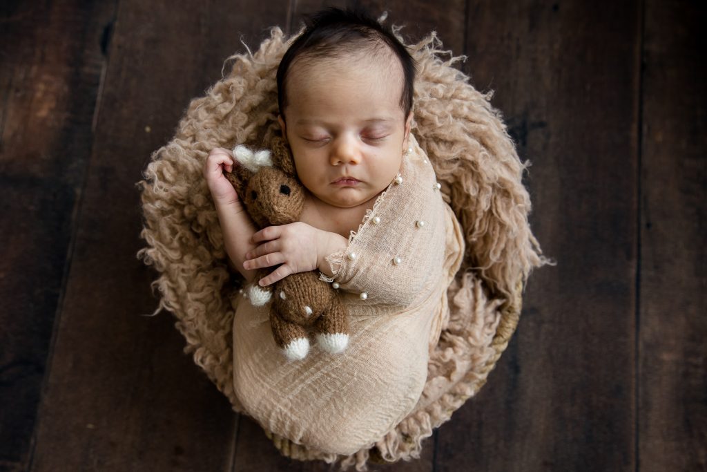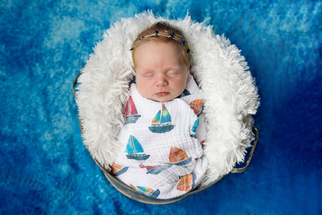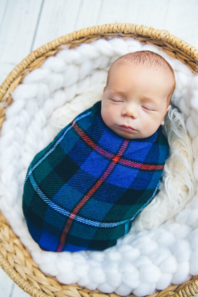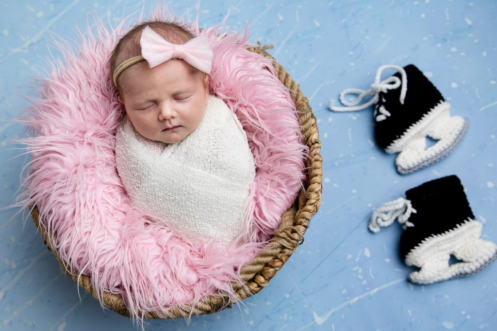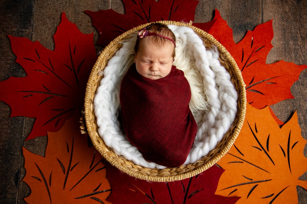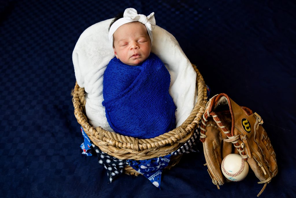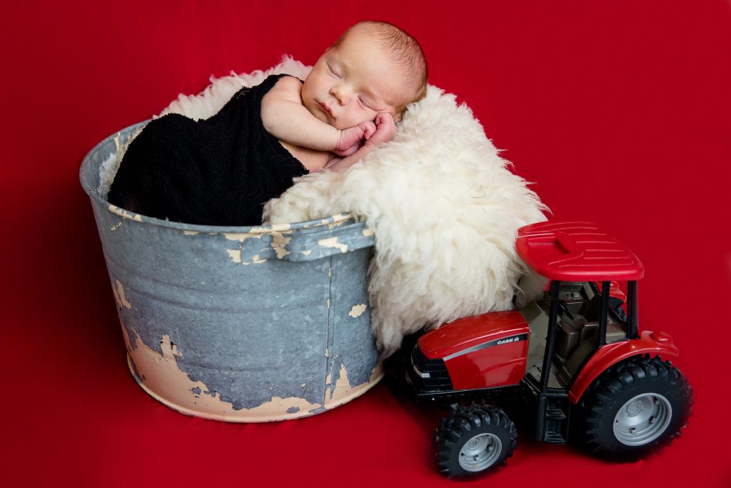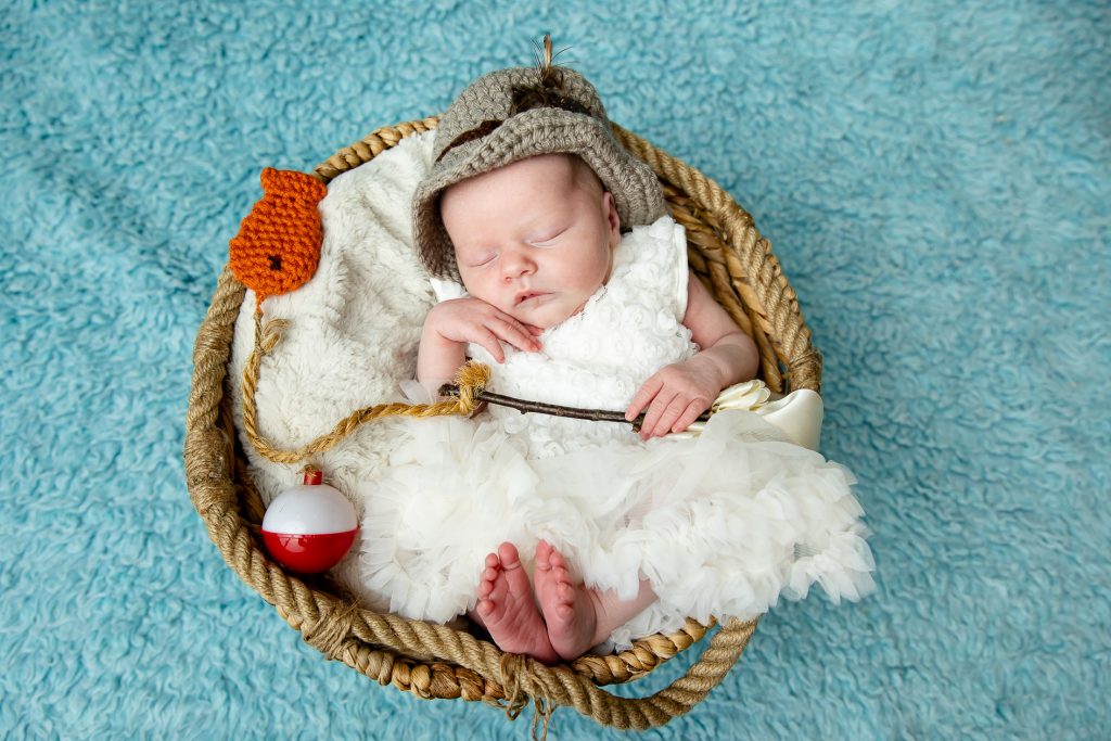 Most newborn sessions are captured at my studio with various backgrounds and props. I have many outfits/wraps and a variety of items for incorporating hobbies etc.