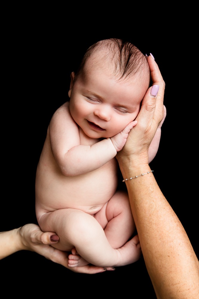 The earlier you are able to do the session and the more sleepy or content the baby is, the more poses that can be done and the easier the session will be. The average age of the newborn we photograph is 7 days old but we realize that this is not always possible. We still make the best attempt to do a newborn session for a baby up to 3 weeks old, but generally by this age the baby will not go into the bendy poses or will open their eyes more, which is not a bad thing, we can certainly still capture your newborn while they are awake but it’s the easiest if trying to get those sleepy baby poses. The best time of day for a newborn session is usually in the morning when the baby is most likely to be sleeping, and after a big feed. Keeping the baby awake for an hour before the session can make a big difference. Make sure you have calculated driving time to the studio, so that you can be sure to feed baby fully before departing from your home, but you can certainly top the baby up when you are at the studio.